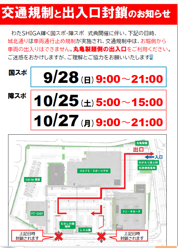 Trailinn彦根城 わたSHIGA輝く国スポ・障スポ 式典開催に伴い交通規制と一部出入口封鎖の期間がございます、お車でいらっしゃるお客様は